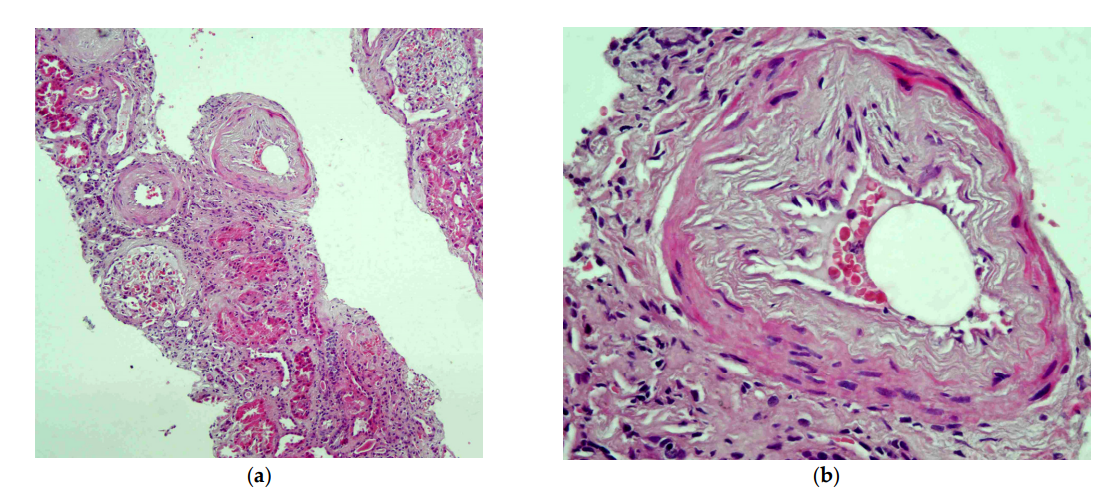 图2. 动脉病变:(a)肾小球肥大,肾小管萎缩、间质纤维化,重度动脉硬化;动脉管腔见边界清、光学空白的圆形-椭圆形脂栓;(b)动脉内皮清晰,管壁内膜纤维化显著增厚;管腔见无内皮覆盖的圆形-椭圆形光学空白脂栓