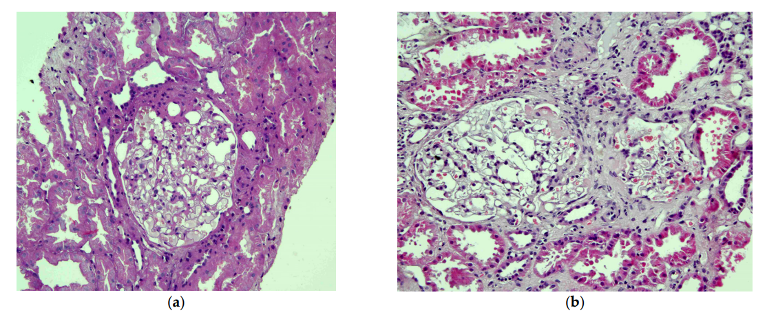 图1. 肾小球改变:(a)肾小球肥大;(b)肾小球肥大伴继发性门周节段性肾小球硬化