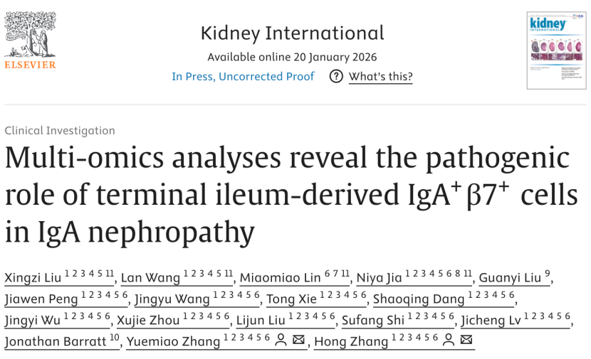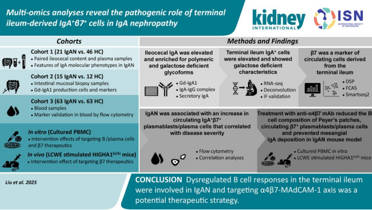 近日,北京大学第一医院肾脏内科张宏、张月苗教授团队在肾脏病学领域顶级期刊Kidney International发表研究论文“Multi-omics analyses reveal the pathogenic role of terminal ileum-derived IgA⁺β7⁺ cells in IgA nephropathy”,首次阐释了回肠来源的IgA⁺β7⁺细胞是IgA肾病中致病性半乳糖缺失IgA1(galactose-deficient IgA1,Gd-IgA1)的重要来源,为长期以来IgA肾病肠-肾轴发病机制假说提供了新证据,并验证α4β7/MAdCAM-1轴或成为具有潜在临床价值的治疗新靶点。
