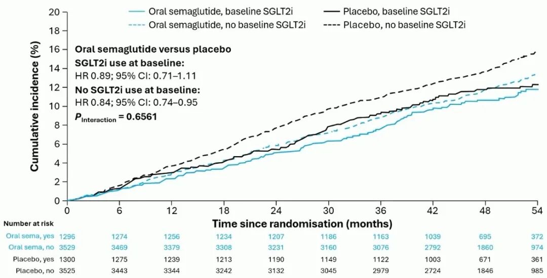 联合治疗分析则解答了关键临床疑问。SOUL研究的预设分析证实,无论患者基线是否使用SGLT2i,司美格鲁肽片的MACE获益均保持一致(P交互作用=0.6561,图4),且与SGLT2i联合治疗的安全性良好[22],这为两类指南推荐药物的联合应用提供了循证依据。
