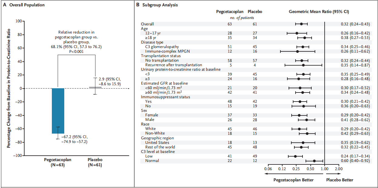 治疗期间,Pegcetacoplan组不良反应发生率与安慰剂组相当,分别为84%、93%,未发生由荚膜细菌引起的严重感染。1例死于新冠肺炎。未发生移植物排斥或丢失。