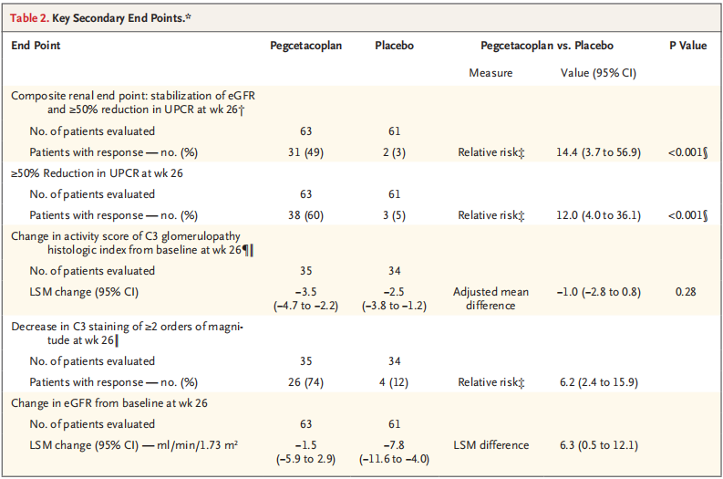 在对5项次要终点分层检验中(表1),与安慰剂组相比,Pegcetacoplan组达到肾脏复合终点(估算肾小球滤过率[eGFR]稳定且UPCR降低≥50%)的患者比例显著更高(49% vs. 3%)(RR 14.4,95%CI:3.7~56.9;P<0.001),这一差异主要由蛋白尿下降驱动——Pegcetacoplan组UPCR降低≥50%的患者达60%,而安慰剂组为5%(RR 12,95%CI:4.0~36.1;P<0.001)。