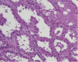 肾穿刺病理检查(图1):免疫荧光阴性。光镜:肾小球:小球系膜细胞和基质轻度增生,系膜基质轻度增多,内皮细胞肿胀,基底膜皱缩,未见嗜伊红蛋白沉积。肾小管:近曲上皮细胞多灶性颗粒变性,细胞空泡变性、肿胀,可见刷状缘脱落,可见红细胞管型,透明管型,崩解的细胞碎屑,近曲小管萎缩(10%)。肾间质:小灶单个核细胞、嗜酸性细胞浸润(10%),小灶纤维组织增生(10%)。小动脉内膜水肿。电镜:足突部分融合,基底膜内疏松层增宽,纤维素沉积。病理诊断:(肾穿刺)病理符合缺血性肾病改变伴肾小球上皮细胞损伤。