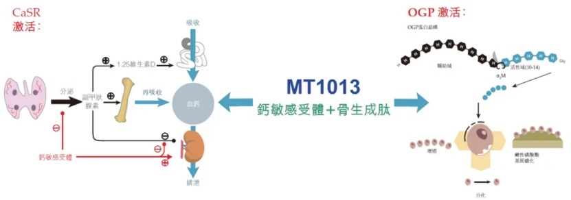 作为麦科奥特自主研发的全球首创(First-in-Class)疗法,MT1013的核心优势在于其开创性地融合了“钙敏感受体(CaSR)+成骨生长肽(OGP)模拟”双重作用机制——可同时激活钙敏感受体(CaSR)与成骨生长肽(OGP)受体,从源头解决继发性甲状旁腺功能亢进症(SHPT)患者的甲状旁腺激素(PTH)、钙、磷代谢失衡问题(图1)。主要开发适应症为SHPT,同时计划拓展至慢性肾病性矿物质和骨代谢异常(CKD-MBD)伴骨质疏松、未接受透析的SHPT等额外适应症。