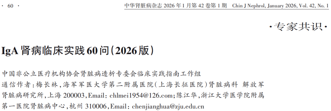 1.中国非公立医疗机构协会肾脏病透析专委会临床实践指南工作组.IgA肾病临床实践60问(2026版)[J].中华肾脏病杂志,2026,42(1):60-76.