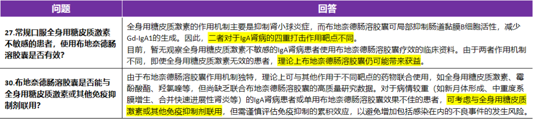 要点解读三布地奈德肠溶胶囊可以与其他药物联合使用吗?共识指出,基于布地奈德肠溶胶囊的独特作用机制,其可与全身糖皮质激素、霉酚酸酯等作用靶点不同的药物联用,适用于病情较重或单用效果不佳的患者,同时,需评估免疫抑制累积效应,避免感染等不良事件风险(表3)。