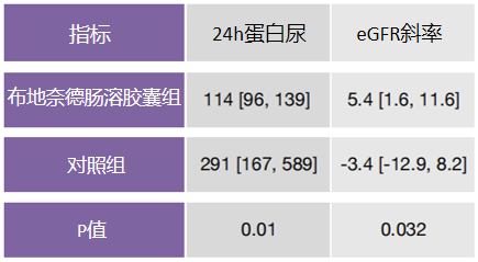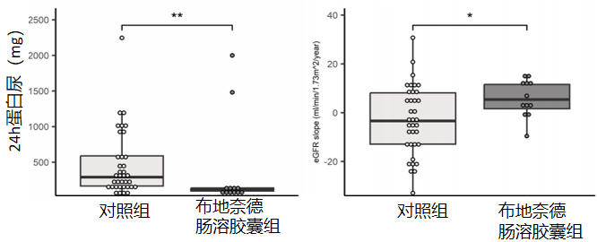 图2. 布地奈德肠溶胶囊持续用药12个月,组间24小时蛋白尿和eGFR的比较