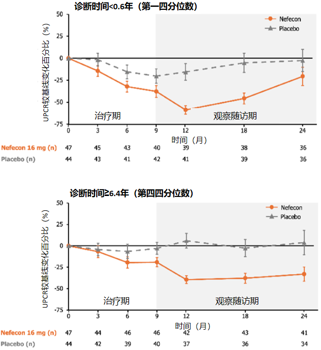 NefIgArd 研究子分析进一步证实,无论患者确诊时间长短,布地奈德肠溶胶囊均较安慰剂更能显著降低蛋白尿、保护肾功能,其中确诊时间较短(<0.6年)的患者,eGFR改善效果更为突出[7](图1)。