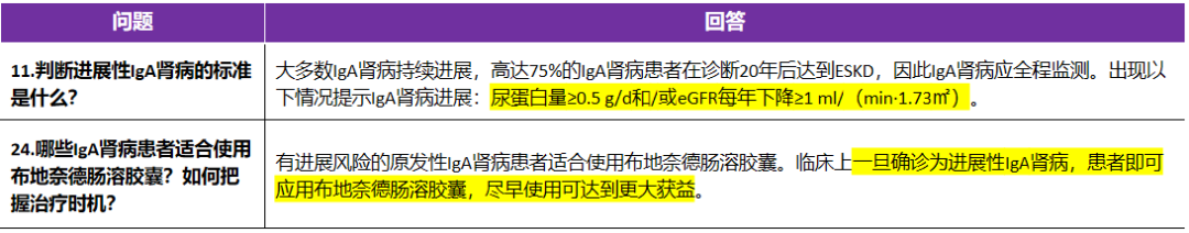 要点解读一进展性IgA肾病的对因治疗时机如何把握?为何需尽早启动对因治疗?IgA肾病呈持续进展特性,20年进展至肾衰竭比例高达75%,因此“早干预”是最大化肾功能保护的关键原则。共识明确,当患者出现尿蛋白量≥0.5 g/d和/或eGFR每年下降≥1 ml/(min·1.73㎡)时,提示IgA肾病进展,应立即启动布地奈德肠溶胶囊治疗(表1)[1]。