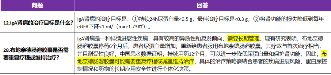 要点解读二IgA肾病为何需要长期治疗?维持治疗的核心策略是什么?IgA肾病具有高异质性和高复发倾向,需长期管理。其治疗目标为持续24h尿蛋白< 0.5 g(最佳<0.3 g)且eGFR年下降<1 ml/(min·1.73㎡)。布地奈德肠溶胶囊需采取个体化长期维持或重复疗程策略,以巩固疗效、延缓疾病进展[1](表2)。