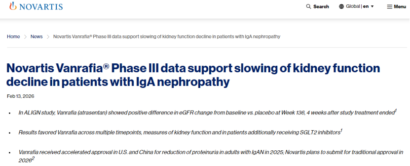 2026年2月13日,诺华公布Vanrafia(阿曲生坦)治疗IgA肾病的Ⅲ期ALIGN研究最终结果,证实其能显著延缓患者肾功能下降,为该疾病治疗添新证。该研究是IgA肾病关键Ⅲ期试验中随访时间最长的,共纳入340例经活检确诊的患者,其中64例联用SGLT2抑制剂。受试者接受约132周的阿曲生坦或安慰剂治疗。