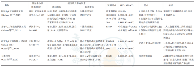 IgA肾病预后的预测工具:目前,临床上常用的预测模型有以下几种(表1)。其中,国际IgA肾病预测工具被KDIGO指南推荐用于预测预后,但不能指导治疗。