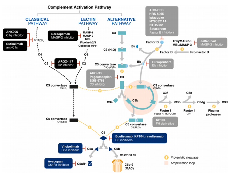 图1. 补体系统及治疗CMKDs肾小球炎症的补体抑制剂