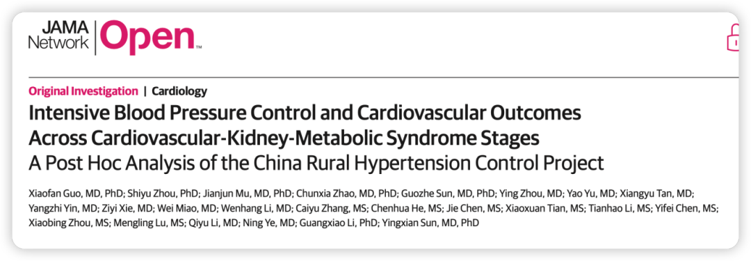 Lu J, et al. Intensive blood pressure control and cardiovascular outcomes across cardiovascular–kidney metabolic syndrome stages: a post hoc analysis of the China Rural Hypertension Control Project. Journal of the American Heart Association. 2024.