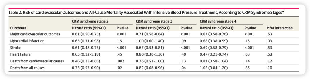 强化降压对全因死亡的影响呈现明显的分期梯度:CKM 2期全因死亡风险降低27%,CKM 3期降低18%,而CKM 4期全因死亡风险与常规治疗无差异(HR 1.02)。交互作用P=0.10,呈边缘显著(表1)。