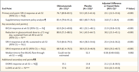 研究主要终点为第52周SLE应答指数4(SRI-4)应答率,即SLEDAI-2K评分较基线降≥4分、BILAG与PGA评分无恶化且无干扰事件;关键次要终点按层级依次为BICLA应答、激素持续减量、持续SRI-4应答、SRI-6应答及首次BILAG复发时间等。