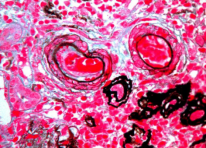 图2. 肾间质小动脉血栓形成,内膜下见RBC碎片