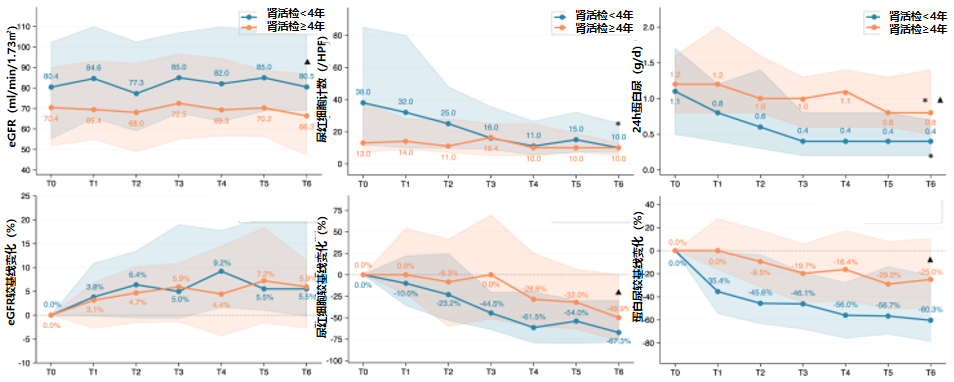 图4. 肾活检≥4年组 vs. <4年组eGFR、血尿、蛋白尿较基线的变化