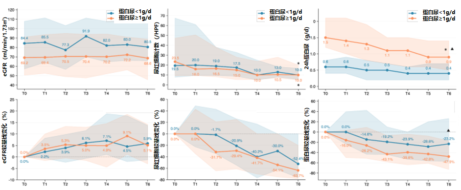 图2. 蛋白尿≥1 g/d组 vs. <1 g/d组eGFR、血尿、蛋白尿较基线的变化