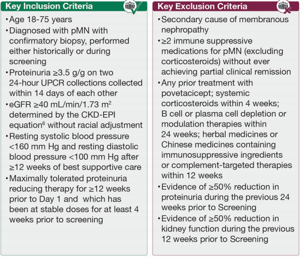此前正在开展的1/2期RUBY-3试验已展现出令人振奋的初步数据:对10例pMN患者给予每4周皮下注射80 mg Povetacicept的治疗方案,截至第48周,患者抗PLA2R自身抗体水平下降83%,蛋白尿水平显著下降82%(95%CI:60%~92%),估算肾小球滤过率(eGFR)全程保持稳定;且实现了100%的免疫缓解(抗PLA2R自身抗体<14 RU/mL)和100%的完全或部分临床缓解,药物整体安全性良好,不良事件多为轻至中度,为后续大样本临床试验奠定了坚实的循证基础。