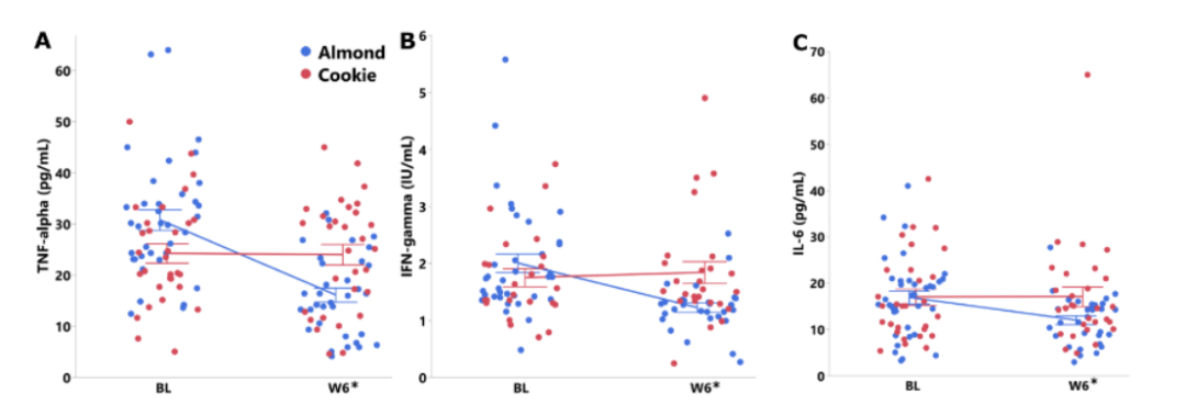 图1:杏仁组和饼干组受试者基线时和第6周时的炎症标志物。(A)TNF-α;(B)IFN-γ;(C)IL-6