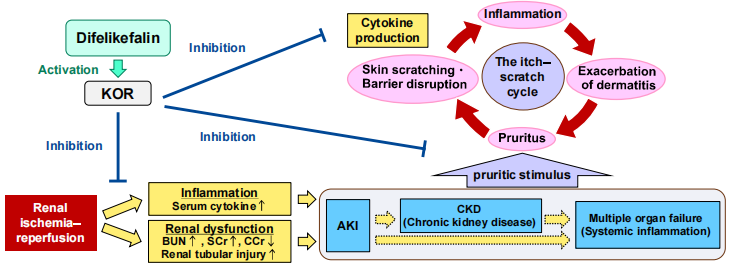 作为一款已在临床用于血液透析患者瘙痒治疗的药物,Difelikefalin此次在急性肾损伤的肾保护与抗炎、难治性CKD-aP治疗中均展现出重要临床价值,其作用机制围绕κ阿片受体的信号调节,为肾病领域炎症相关损伤和难治性瘙痒的治疗开辟了新方向。