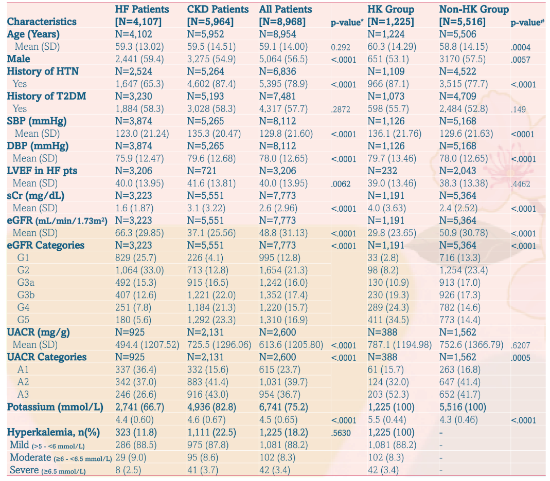 iCaReMe研究是一项全球范围内开展的前瞻性、观察性真实世界登记研究,分析CKD、2型糖尿病、高血压和心力衰竭患者的临床特征、疾病管理模式、长期预后等[1]。WCN 2026上公布的iCaReMe全球注册研究(NCT03549754),纳入亚太、拉美、中东及非洲28个国家的8968例成年CKD/HF患者,其中71.8%合并CKD(平均eGFR 37±25.6 ml/min/1.73 m²),旨在分析高钾血症(血清钾>5.0 mmol/L)的患病率、危险因素及治疗现状。该研究显示: