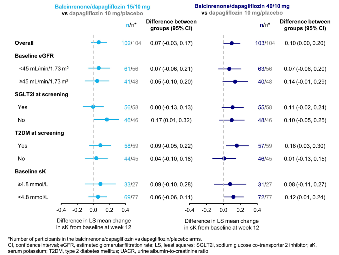 血清钾变化微小,不影响临床应用治疗12周时,Balcinrenone/达格列净15 mg/10 mg组血清钾较基线的变化为+0.07 mmol/L(95%CI:-0.03~0.17,p=0.16),差异无统计学意义;Balcinrenone/达格列净40 mg/10 mg组血清钾较基线的变化为+0.10 mmol/L(95%CI:0.00~0.20,p=0.046),差异具有统计学意义,但变化幅度微小,未达到临床显著影响水平。