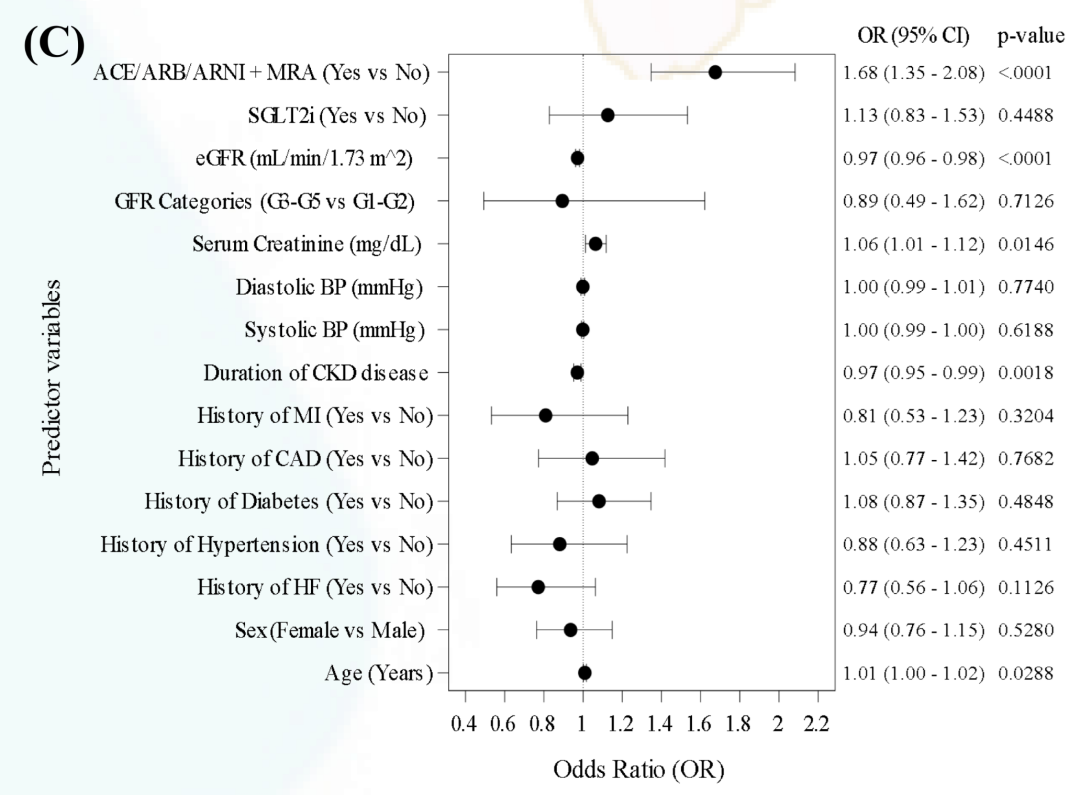 02、危险因素明确多因素分析显示,RAASi类药物使用(OR=1.68,95%CI:1.35-2.08,p<0.0001)和血清肌酐水平升高(OR=1.06,95%CI:1.01-1.12,p=0.0144)是高钾血症发生的独立危险因素(图1)。