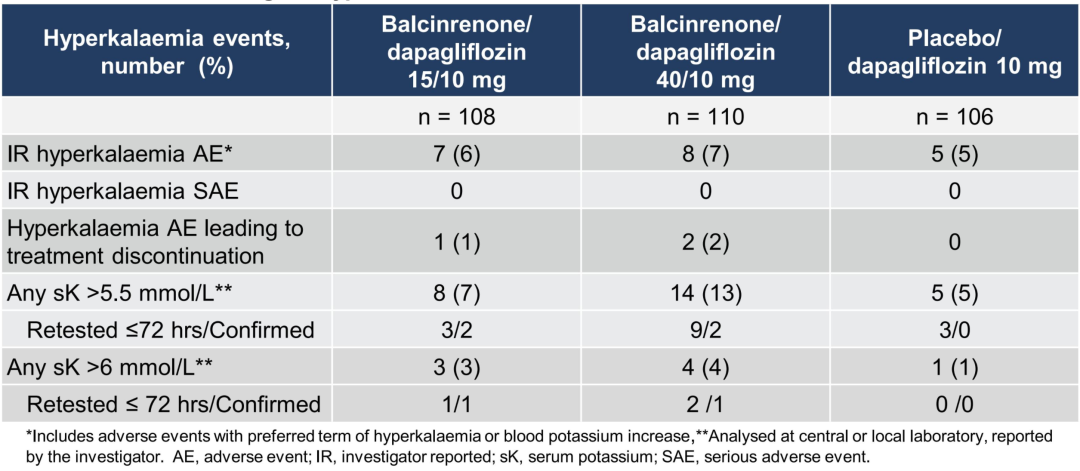 高钾血症发生率低,无严重不良事件研究者报告的高钾血症不良事件发生率极低,且三组间发生率相当,无明显差异(表2)。血清钾>5.5 mmol/L在Balcinrenone/达格列净40 mg/10 mg组中数值上略高,但复查确认率极低(9例复查仅2例确认)。所有高钾血症相关不良事件均未达到严重级别,未出现因高钾血症导致的严重临床结局,证实联合方案的高钾血症风险处于可控范围。