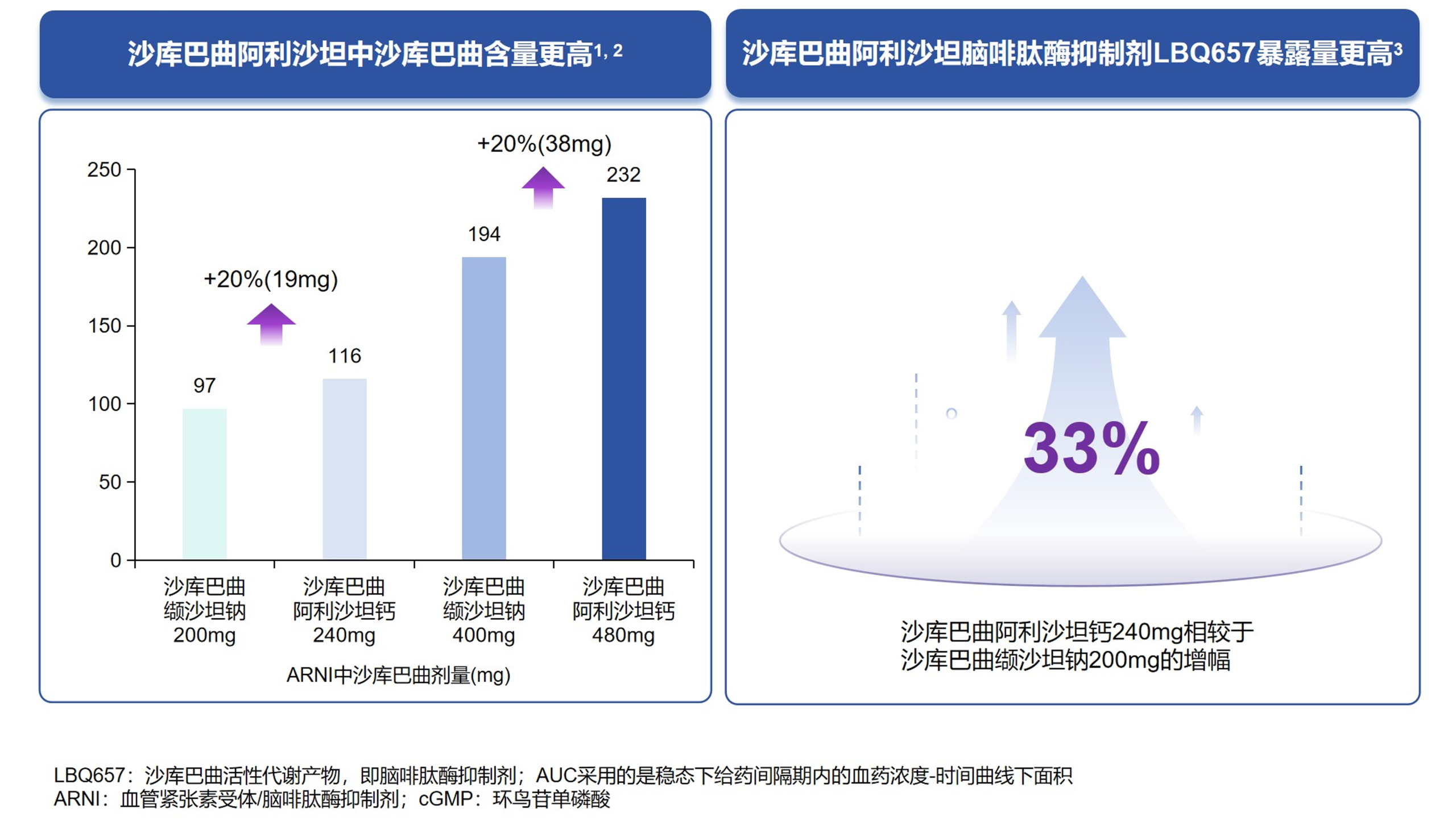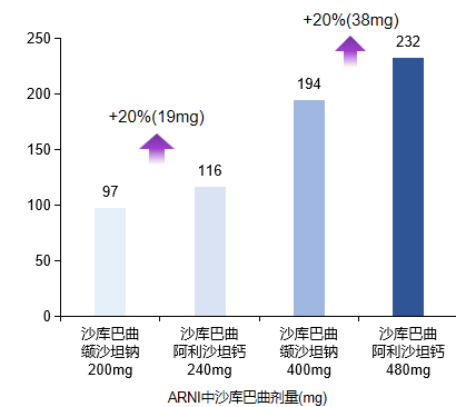沙库巴曲阿利沙坦钙选择了更优ARB阿利沙坦,优化配比实现了同剂量下沙库巴曲含量提升20%,这意味着能带来更强利钠肽效应,从而提供更强的心肾保护作用;
