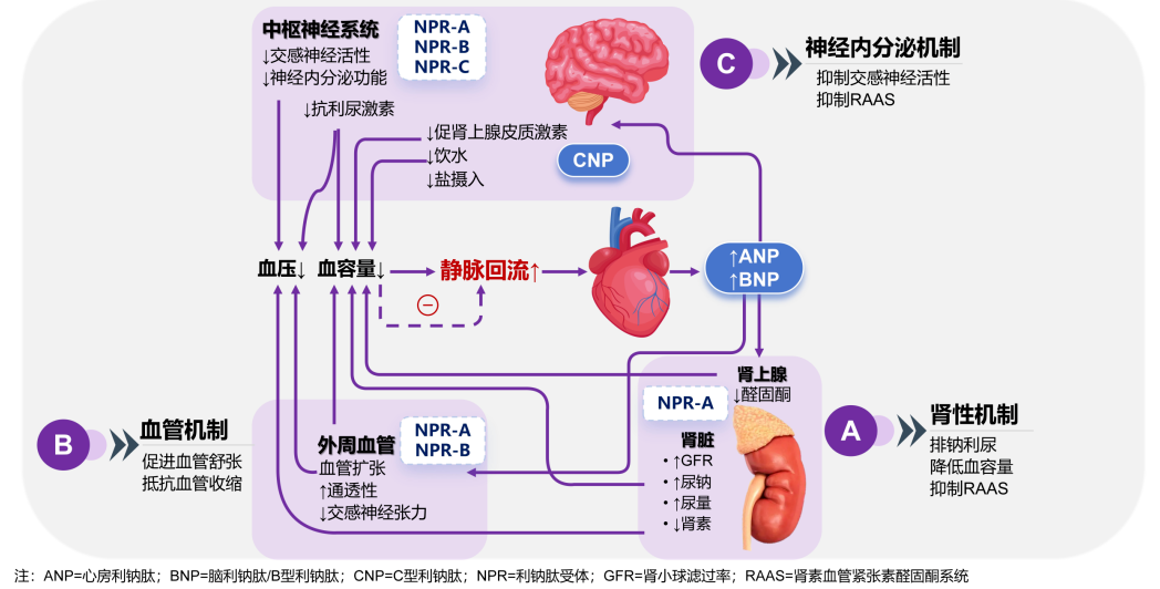 1981年de Bold团队开创性发现了心房利钠肽(ANP),随后BNP、CNP相继被发现。利钠肽的作用机制是,与受体结合后催化第二信使cGMP的合成,从而介导利钠利尿、扩血管、抗纤维化等核心效应,带来降压和靶器官保护的双重获益: