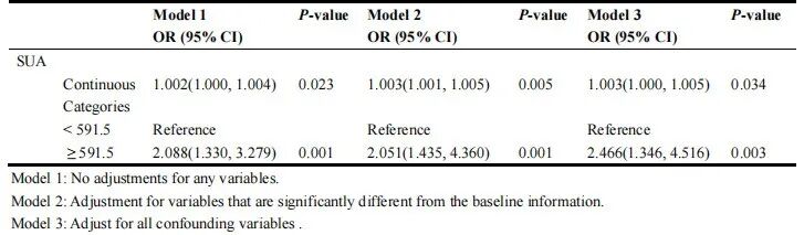 此外,为调整混杂因素并进一步检验SUA与CKD的关系,构建了三个模型(表2)。结果显示SUA与CKD呈强正相关。在未调整的模型中,比值比为1.002,95%CI:1.000~1.004(P=0.023)。在调整了所有混杂因素后的模型3中,这种正相关仍然具有统计学意义(P=0.034)。