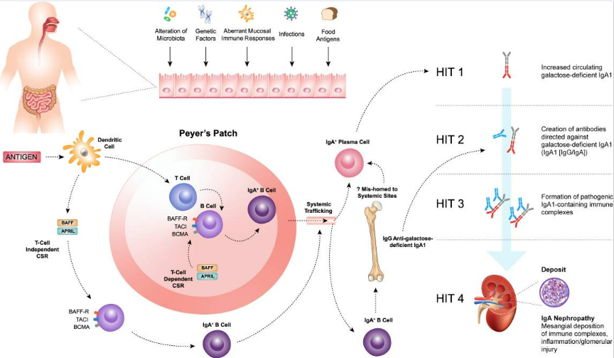 一、B细胞靶向治疗在IgA肾病(IgAN)中的临床研究进展1.IgAN的发病机制与治疗靶点Lafayette教授首先回顾了IgAN的经典“四重打击”发病机制:黏膜免疫系统高反应性导致B细胞淋巴样成熟增强,循环中半乳糖缺陷型IgA1(Gd-IgA1)水平升高(HIT1);机体产生针对Gd-IgA1的自身抗体(IgG和IgA,HIT2);二者形成致病性免疫复合物(HIT3);最终沉积于系膜区,引发炎症反应、补体激活及肾小球与间质纤维化(HIT4)。这一发病机制为精准靶向治疗提供了理论依据[1]。