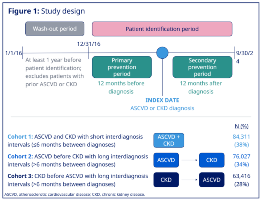 近期ACC 2026公布的一项大规模研究,利用了美国Komodo Healthcare Map数据库,深入分析了2017~2024年间确诊为ASCVD合并CKD 3~4期的223 754名患者的真实诊疗情况。该研究根据ASCVD和CKD 3~4期诊断的时间序列,将患者划分为三个队列:队列1为同时确诊ASCVD和CKD(6个月内);队列2为先确诊ASCVD后确诊CKD;队列3为先确诊CKD后确诊ASCVD(见图1)。借助这种时序划分,研究系统评估了在确诊前后12个月内,真实世界临床实践对ASCVD与CKD一、二级预防指南的依从性。