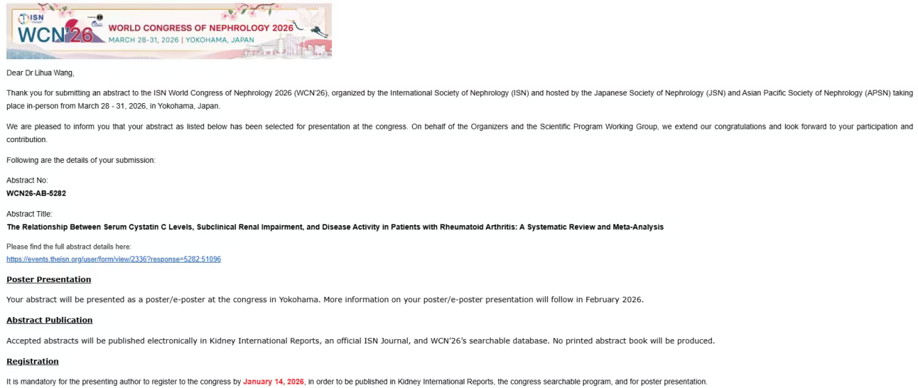 引言在2026年世界肾脏病学大会(WCN 2026)上,哈尔滨强直风湿医院王丽华教授团队发布最新系统综述与Meta分析研究,聚焦类风湿关节炎(RA)这一可累及肾脏的系统性自身免疫病,探讨血清胱抑素C(Cys C)与患者亚临床肾功能损害、疾病活动度的关联。Cys C是评估肾小球滤过功能的敏感标志物,而RA慢性炎症既易诱发隐匿性肾损伤,又可能影响Cys C水平,二者关联的明确性对临床诊疗至关重要,该研究也为RA相关肾损伤的早期评估提供了新的循证参考。