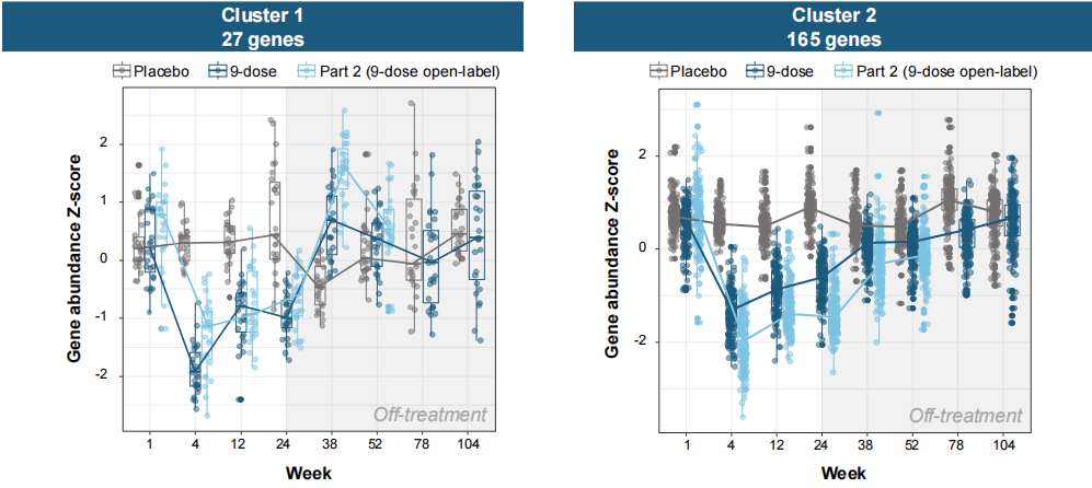 研究结果全血RNA测序鉴定出多个差异表达基因簇,这些基因在治疗期间随时间呈现与处理相关的表达变化(图3)。