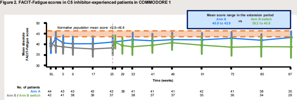 而对于既往接受过C5抑制剂治疗的PNH患者的COMMODORE 1研究,患者在接受可伐利单抗治疗后,疲劳水平在97周的随访中始终保持稳定,延长期FACIT-Fatigue平均评分在40.8~42.9之间(图2)。