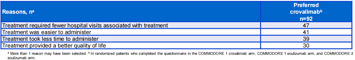 患者青睐可伐利单抗的核心原因包括治疗所需的医院就诊次数更少、给药方式更简便、治疗耗时更短,以及能带来更好的生活质量(表1)。