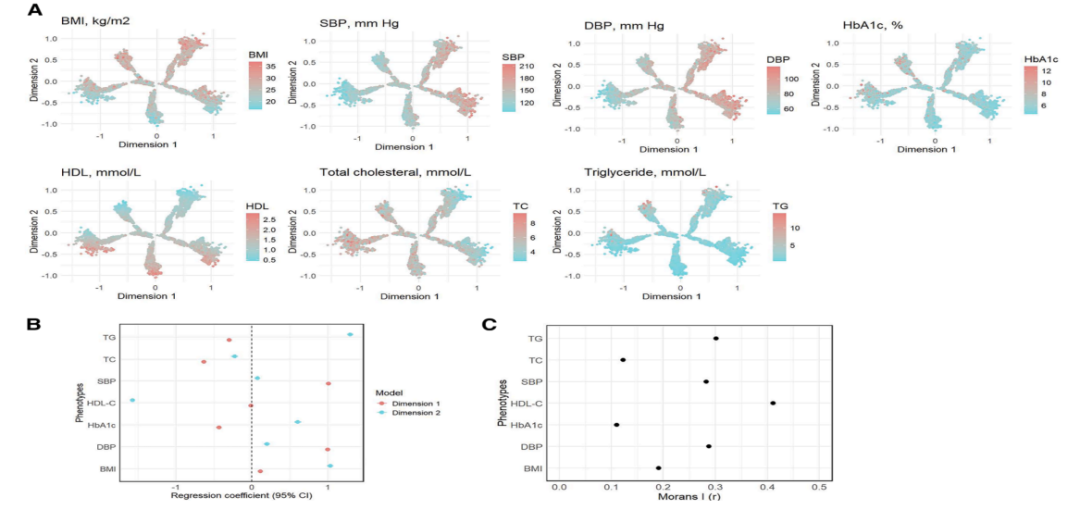 研究采用7项常规临床指标——BMI、收缩压(SBP)、舒张压(DBP)、糖化血红蛋白(HbA1c)、高密度脂蛋白(HDL)、总胆固醇及甘油三酯,将T2DM的异质性摆在1张可解释的连续性地图上(图3)。图谱上的每个点代表具有特定表型特征的个体,混合特征的患者位于主树干中心,极端表型逐渐延伸至树梢,从而更清晰地呈现糖尿病的异质性,避免了传统“硬性分类”的局限。