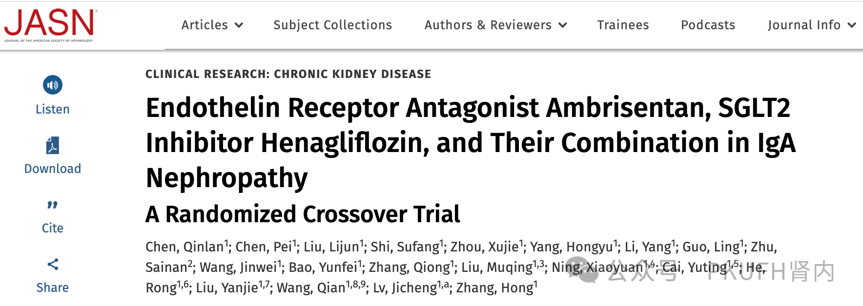 近日,北京大学第一医院肾脏内科团队研究成果《Endothelin Receptor Antagonist Ambrisentan, SGLT2 Inhibitor Henagliflozin, and Their Combination in IgA Nephropathy: A Randomized Crossover Trial》发表于肾脏病学领域顶级期刊Journal of the American Society of Nephrology(IF 9.4)。吕继成教授为本文通讯作者,陈沁兰博士及陈沛副主任医师为本文共同第一作者。