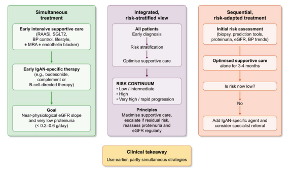 序贯支持者承认:延迟治疗可能带来可避免的肾单位丢失,但IgA肾病进展以月–年为单位,数月严密监测不会造成不可逆损伤;且高危患者常在仅加一种药(如换用双重受体拮抗剂、加耐赋康或伊普可泮)后即可转入低危。若多数患者1~2种序贯用药即可达标,普遍同步多药联用则过度治疗。