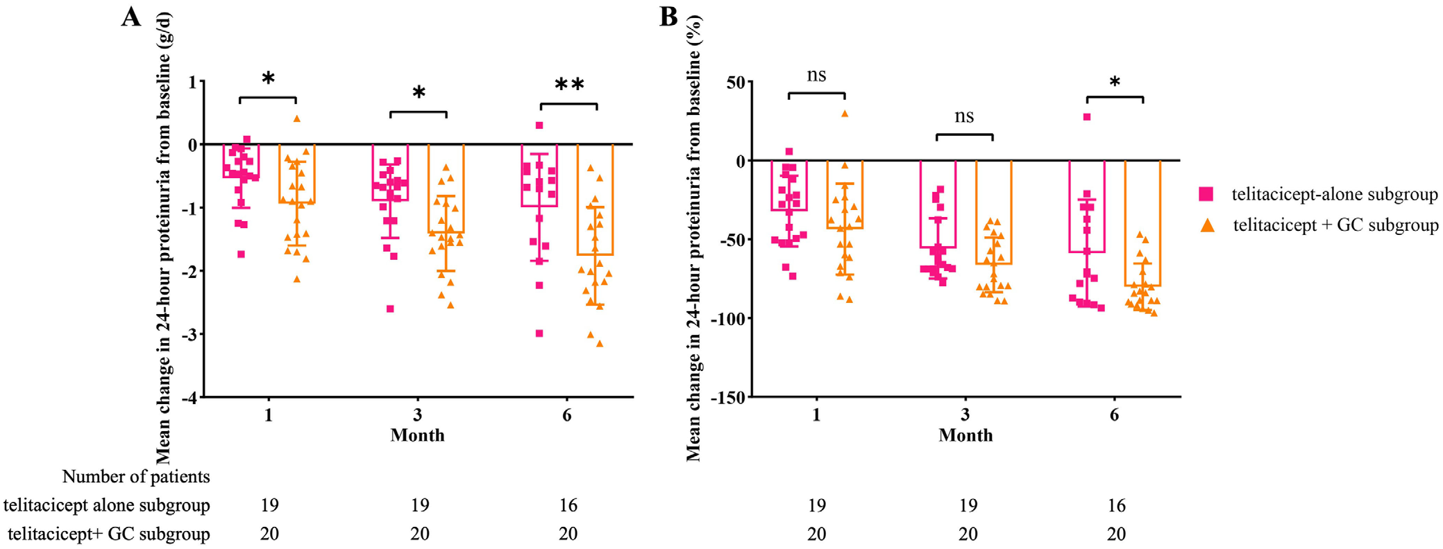 图3. 泰它西普单药亚组与泰它西普+GC亚组24小时蛋白尿较基线变化的比较