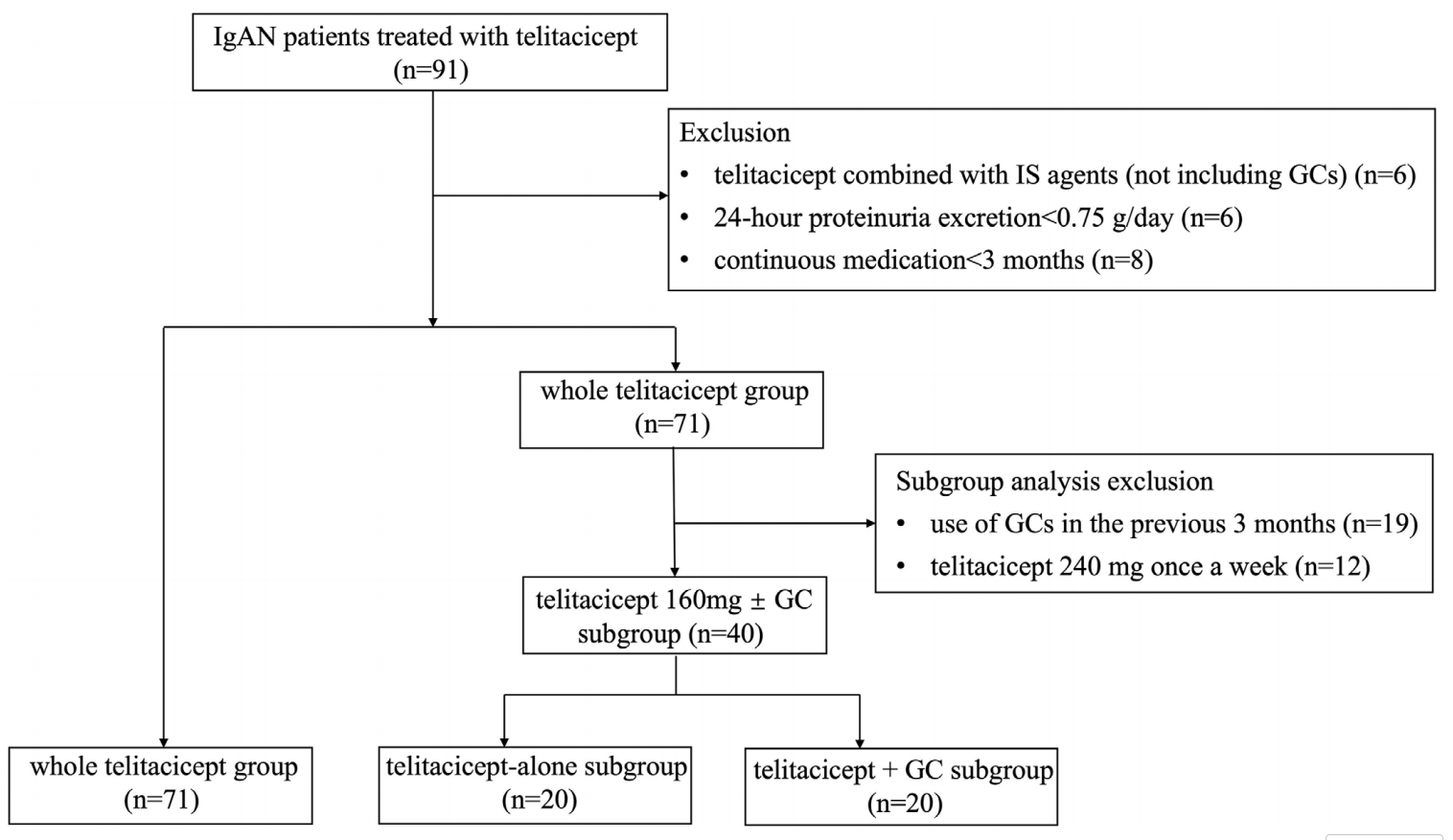 排除标准:继发性IgA肾病;联用激素以外的其他免疫抑制剂;24小时尿蛋白<0.75 g/d;泰它西普治疗治疗时间不足3个月。