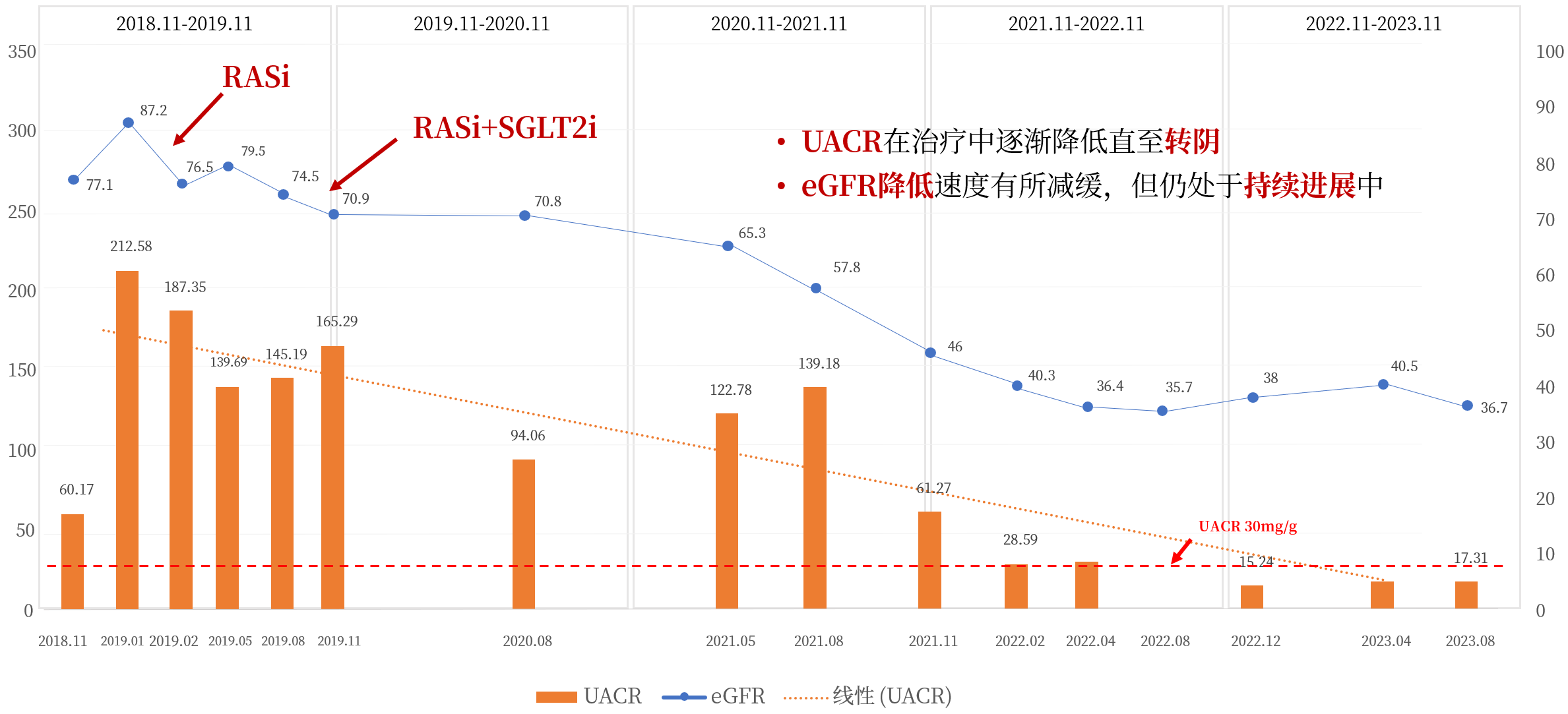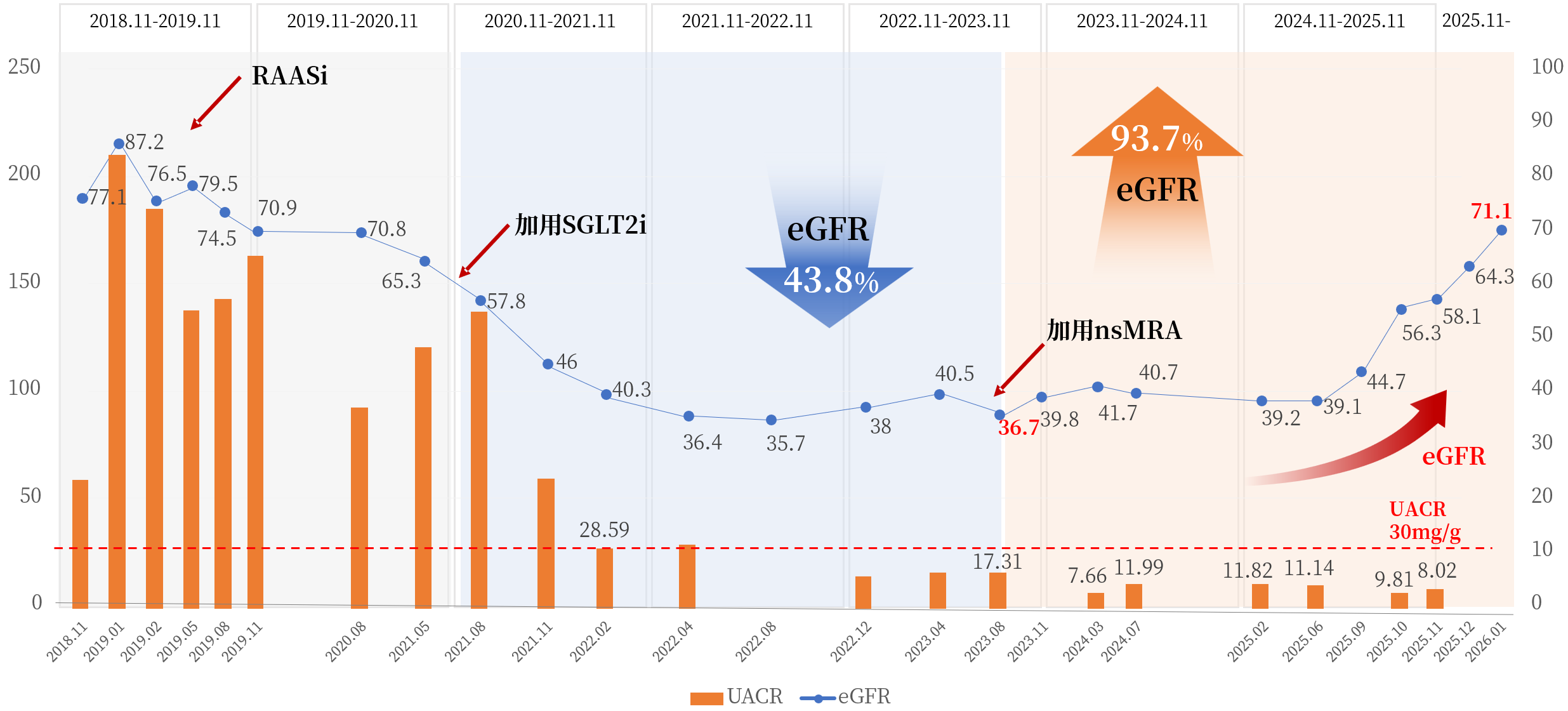 图1. 患者UACR逐渐降低接近“正常”(持续<30 mg/g),但eGFR仍呈进行性下降
