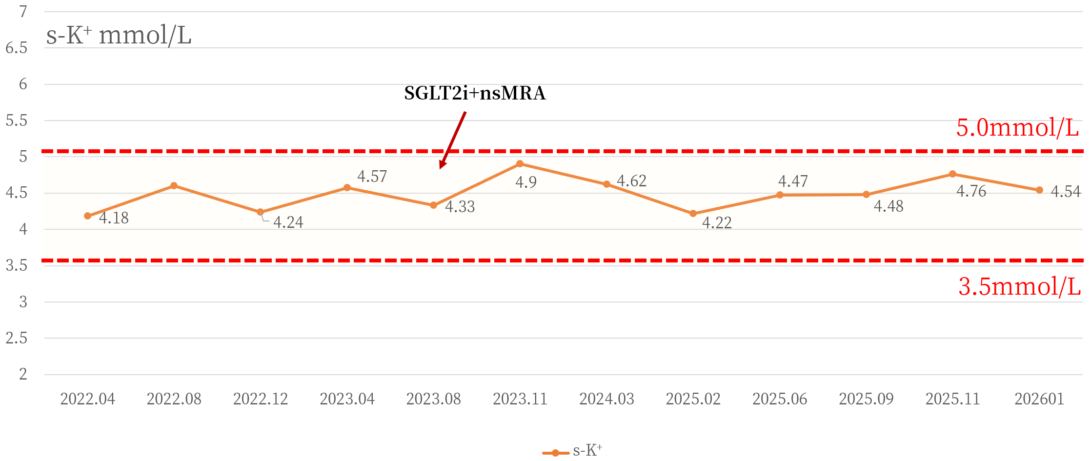 安全性方面,高钾血症是MRA应用中的主要关注点。在本病例中,这一风险得到了良好管理:整个随访期间,患者血钾水平始终维持在安全范围内(图3)。这表明,在规范临床管理下,非奈利酮在高龄患者中同样具有良好的安全性,其相关高钾血症风险具有可预测、可监测、可管理的特点。