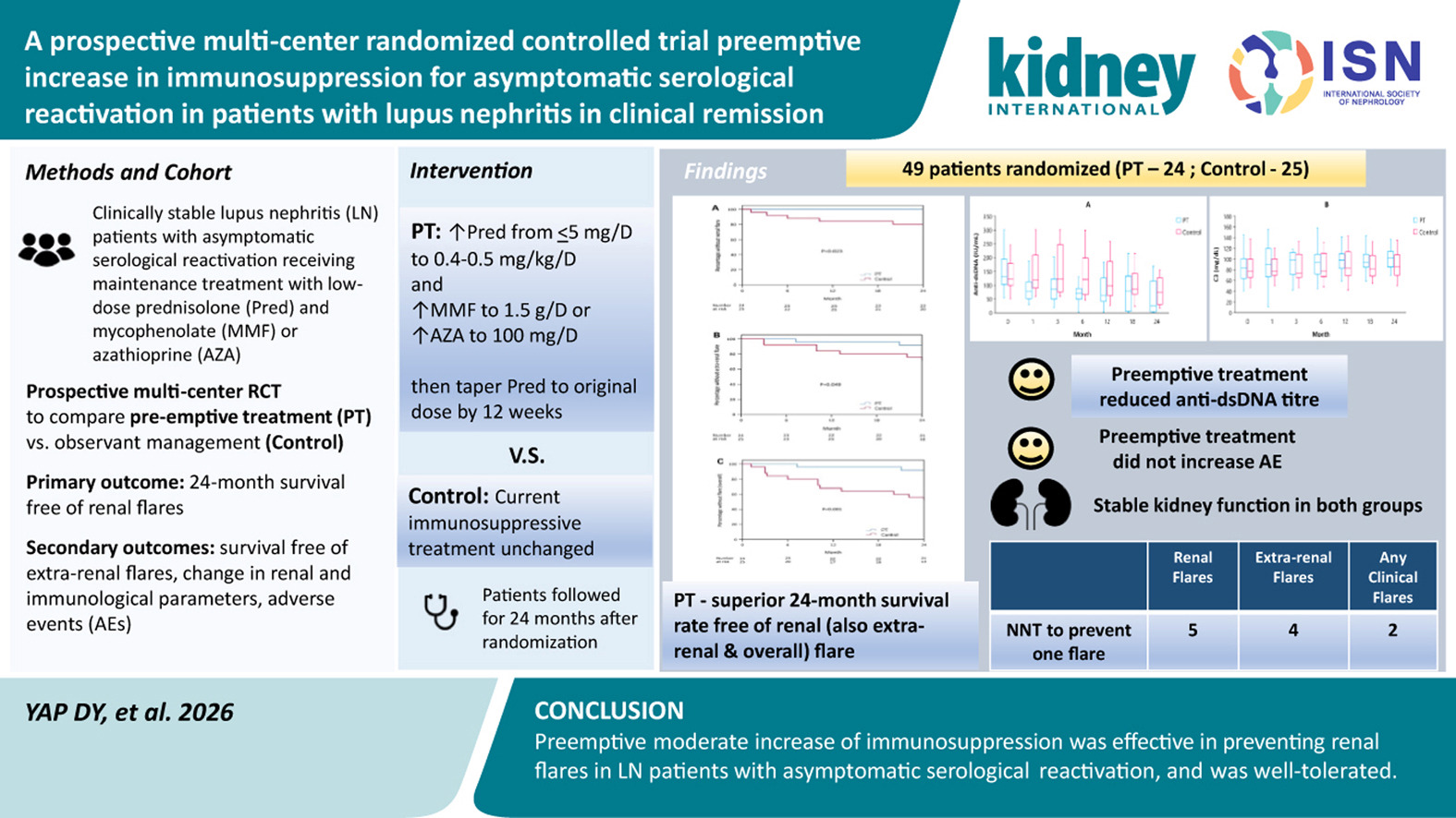 陈德茂等的这项前瞻性、多中心、随机对照试验,在香港3家医院开展(ClinicalTrials.gov注册号:NCT 04870359),比较了预防性强化免疫抑制与常规观察管理对临床缓解、伴无症状血清学复阳的狼疮性肾炎患者在24个月内预防肾脏复发、肾外复发及总体复发的效果,并评估了安全性。