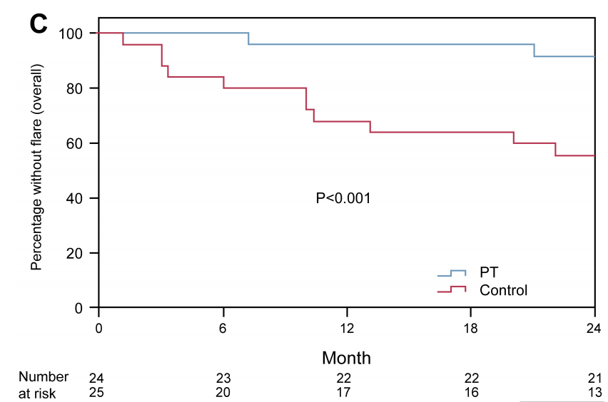 24个月无疾病复发生存率:预防性治疗组显著优于对照组(91% vs. 52%,P<0.001)(图4)。预防1次任意临床复发所需治疗的患者数为2例。